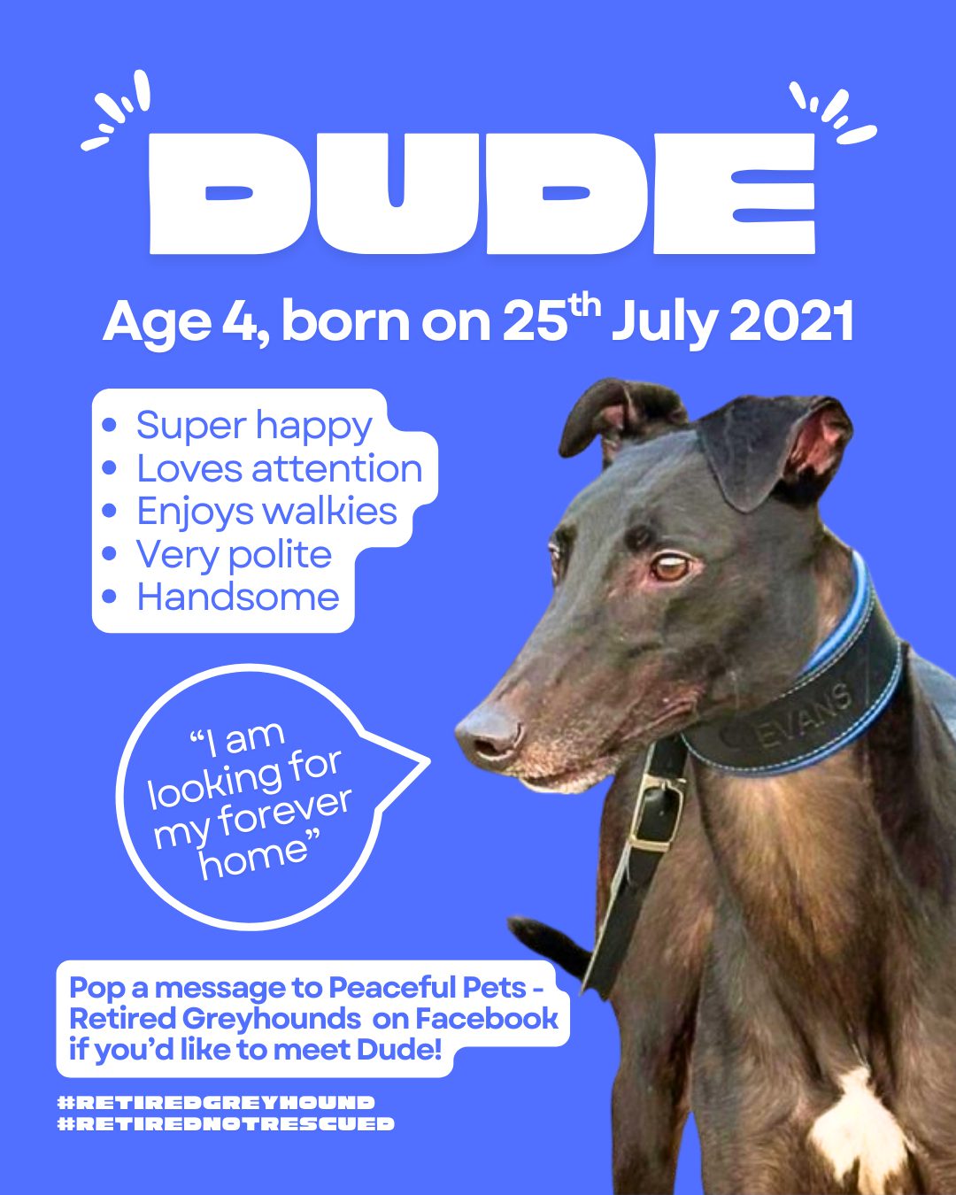 Dude is a very happy 4 year old boy. He loves attention, enjoys his walkies, is very polite and is of course very handsome! To meet Dude contact Peaceful Pets - Retired Greyhounds on Facebook and pop them a message <3